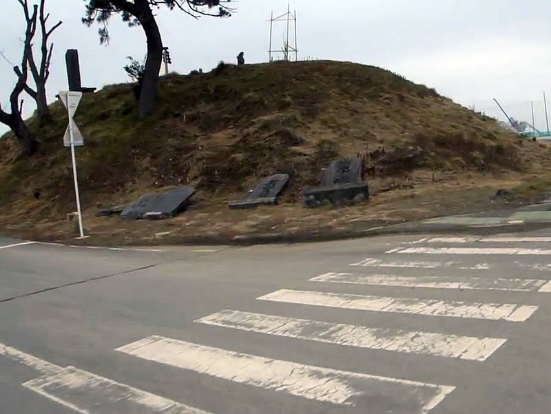 | Hiyoriyama Hill – this is a man made 6.3 meter (21 feet) high hill where a shrine once existed. The small shrine along with a man who was taking care of it were washed away by the tsunami. A new torii was erected along with some temporary markers to allow people to come here and leave flowers and other offerings for the deceased. |