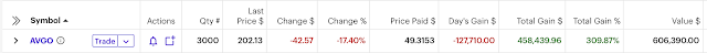 Nvidia (and other tech stocks that were considered AI plays) took a shellacking on Monday.  Nvidia fell nearly 17% wiping out over $589 billion in market capitalization.  Myself, I own Broadcom (AVGO).  But that was way before it’s chip designs were designated as an AI play (I bought/accumulated the stock years ago because they have been a key supplier of chips for wireless devices; I never added more shares once it became an AI chip stock though).  AVGO tanked by over 17.4% today amounting to a paper loss of over $127K.  My reaction to that was BFD because it’s still way up over 300%.  Additionally, my portfolio on that account still finished in the green for the day because of Apple; the majority of my AAPL in this ROTH IRA brokerage account is from ESOP and RSU’s plus retail shares bought in 1997; I covered that journey before (even after all of the subsequent accumulation of retail shares, I’m still up over 2000% ROI for AAPL in this account).