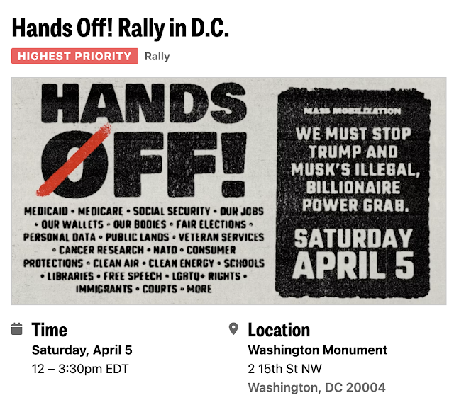 Protests against the regime of Felon47 and Elon Musk are now slated in over a thousand locations across the U.S. and in a few cities in other countries beginning around noon local time on April 5th (today as of this pre-scheduled posting) in those cities/towns.  The main mass mobilization however is in Washington, D.C. near the Washington Monument.