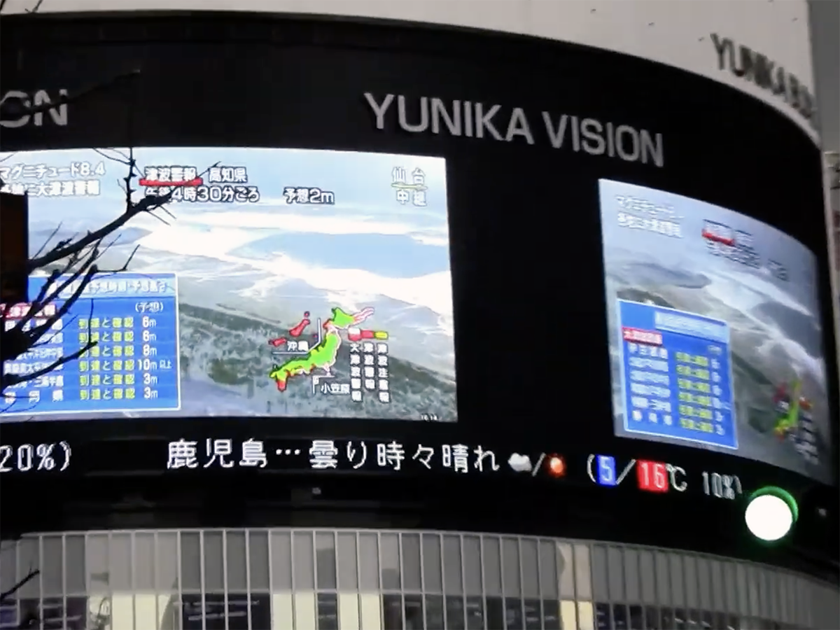 Yunika Building just a short walk away, has much larger displays so headed there and watched NHK News playing live feeds of the major tsunami that was now hitting/engulfing the coastal areas of Tohoku (so many of us were just stunned watching these events unfold in real time). Archive of the original NHK broadcasts.