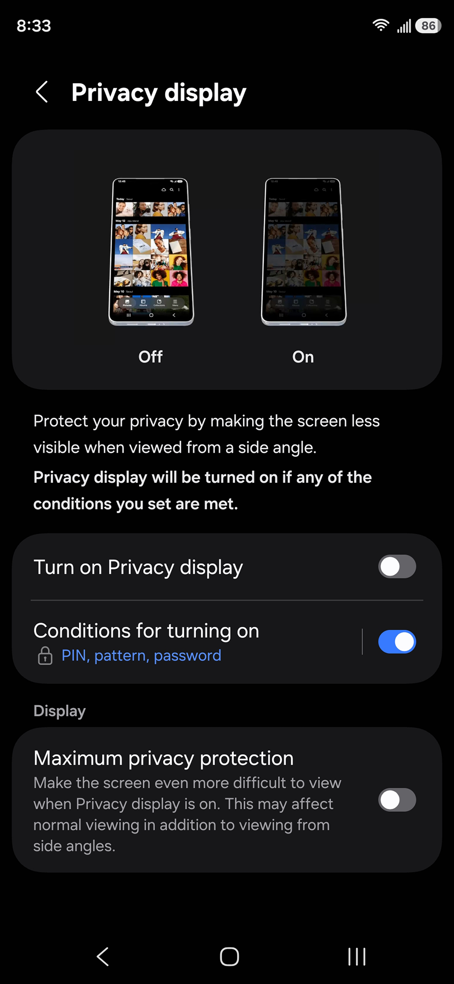 The feature can be turned on more granularly for specific apps and/or for specific actions (such as when entering a PIN, pattern, or password in Settings, secure folders, or the lock screen). The maximum privacy protection does warn this may make it more difficult to view the display even under normal use. Regardless, this is something that Samsung could tweak or better yet, provide a way for users to make granular adjustments for their own vision.