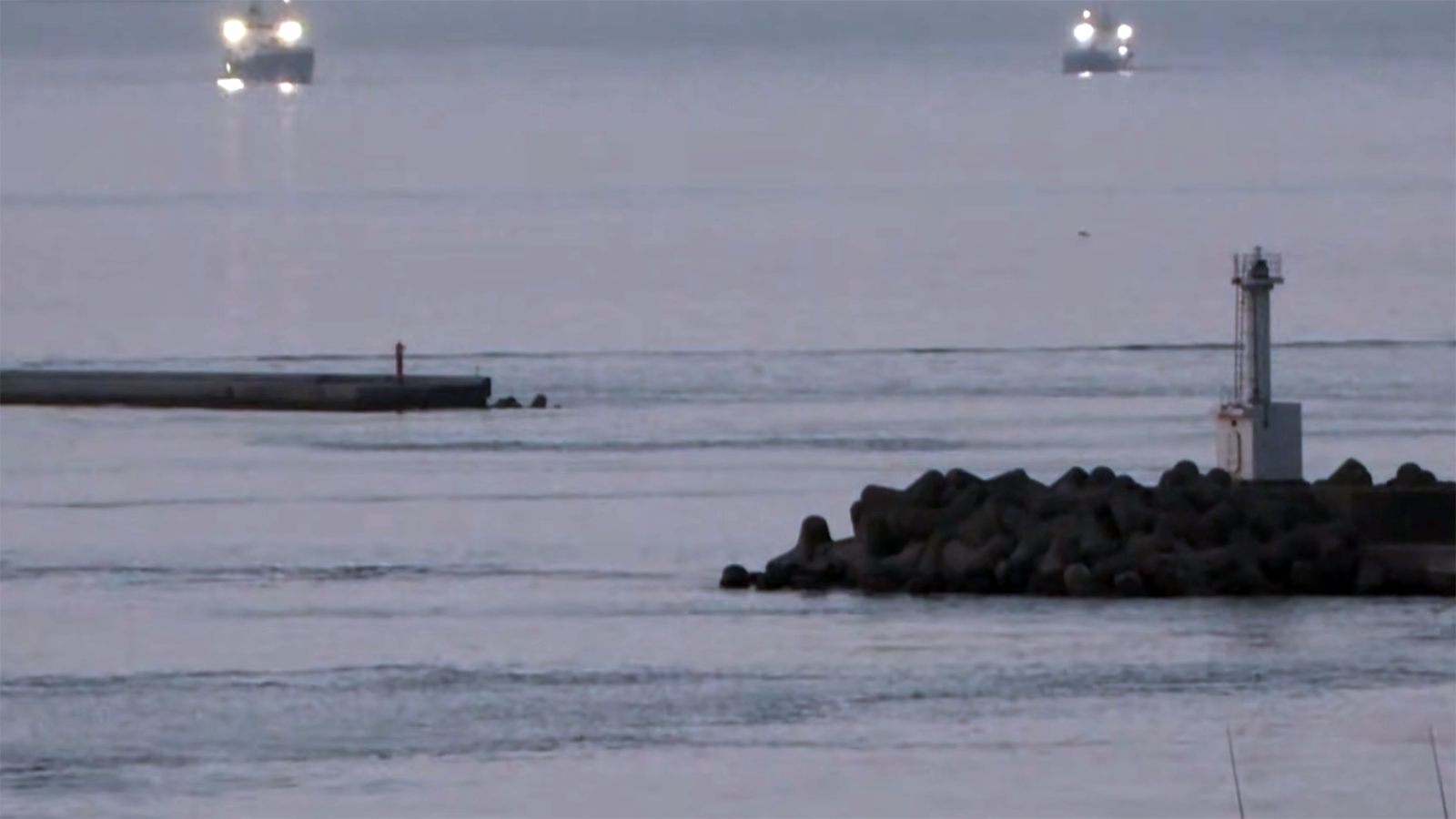 Small tsunami waves at around 18:35 JST (the bottom portion of the seawall was exposed around an hour ago).