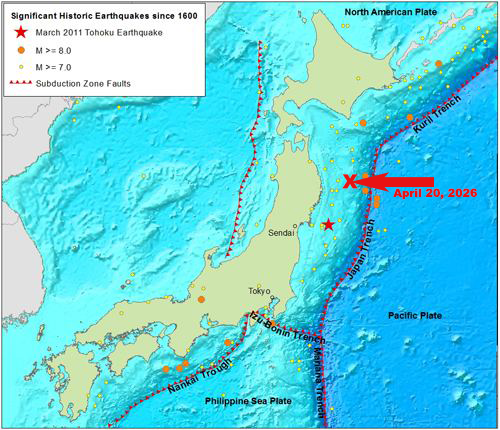 The epicenter occurred in an area where past Sanriku earthquakes have occurred (the largest being the 1896 Meiji-Sanriku quake that measured an M8.5 and caused two large tsunami waves including one that measured 38.2m/125ft).