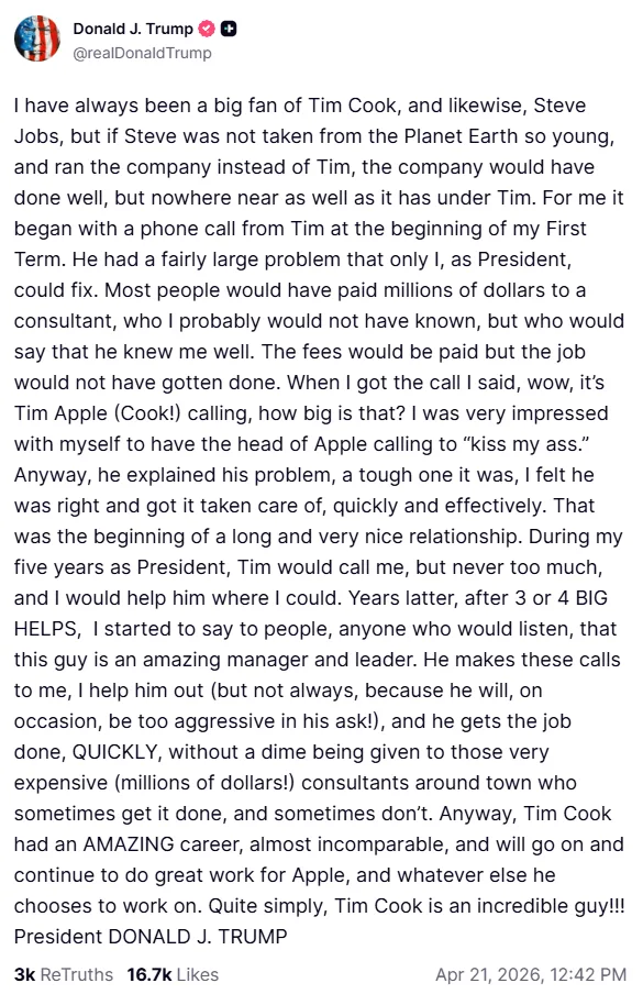 In another long and deranged social media posting that was in regards to Apple CEO Tim Cook (aka Tim Apple) stepping down later this year, the POTUS mentioned at one point, I was very impressed with myself to have the head of Apple calling to “kiss my ass.”
