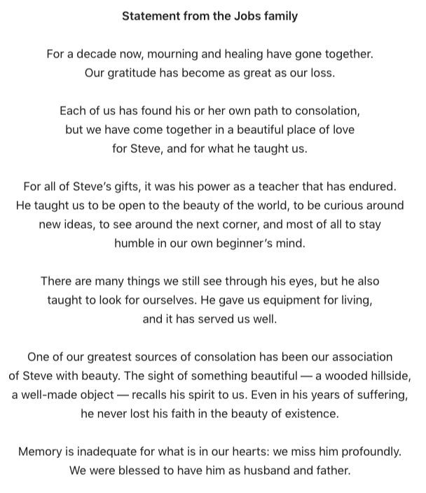 14 years ago on October 5, 2011 (after 3PM Pacific), Steve Jobs passed away peacefully surrounded by family....
